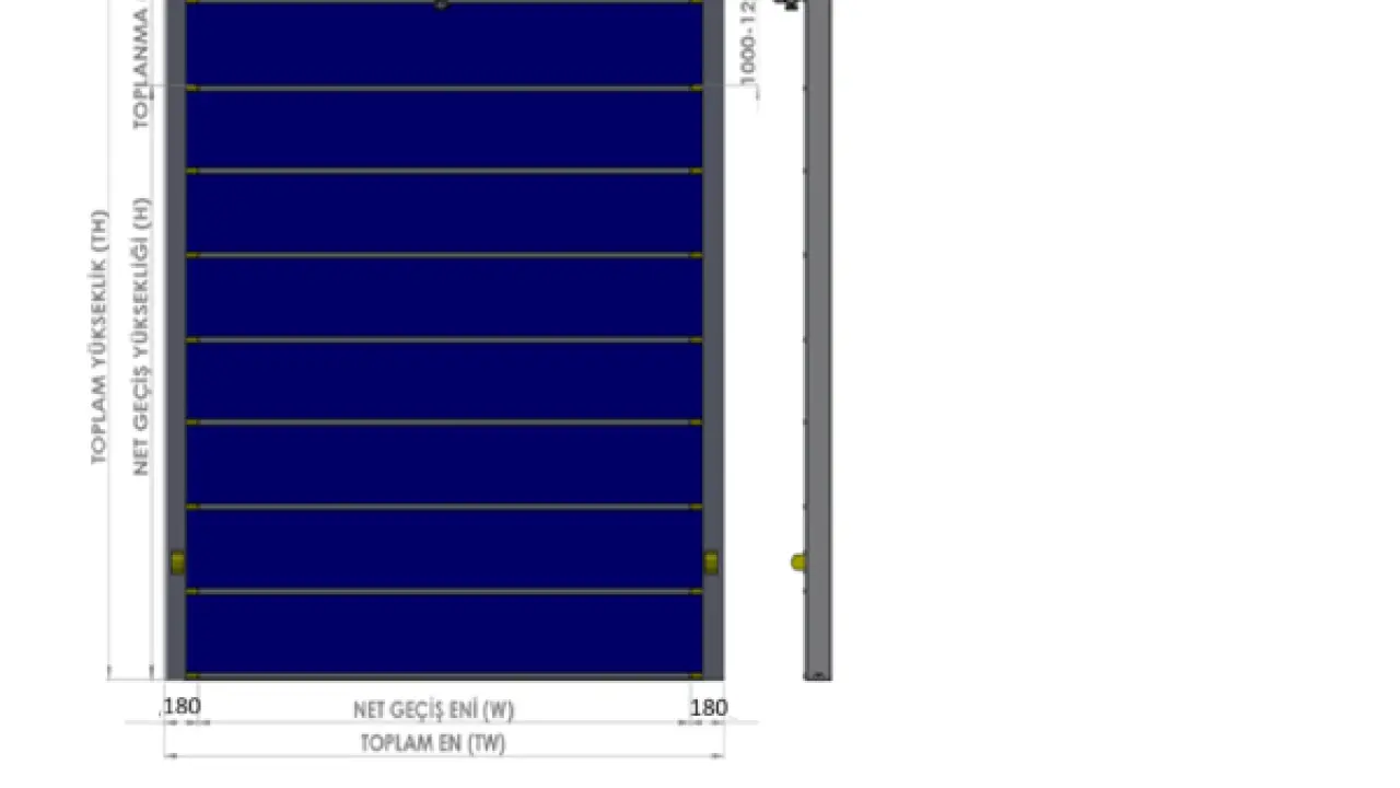 3N-DUBLEFOLD çift kat katlanır tip hızlı PVC kapı, 900gr/m⊃2; PVC branda malzemesinden mamul, çift kat PVC brandanın 4 ayrı noktadan montajı yapılan 120×55 alüminyum ekstrüzyon bar ile güçlendirilmiş yapıda, şaft üzerine sarılan kayışlar vasıtasıyla çalışan iki yanda çelik konstrüksiyon dikmelerin kılavuzlarında hareket eden, şafta bağlı olan redüktör ve buna bağlı olan motorun çalışması ile çift kat PVC perde aksamını güçlendirilmiş alüminyum barlarla alttan yukarıya doğru çekmesi prensibiyle çalışan kapılardır.