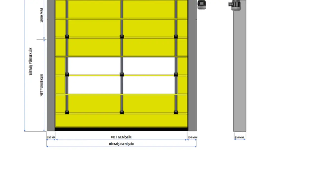3N-FOLD katlanır tip hızlı PVC kapı, 900gr/m⊃2; PVC branda malzemesinden mamul, tek kat PVC brandanın cepleri içerisine Ø27x2mm. çelik borularla güçlendirilmiş yapıda, şaft üzerine sarılan kayışlar vasıtasıyla ile çalışan iki yanda bulunan galvanize edilmiş dikmelerin kılavuzlarında hareket eden, şafta bağlı olan redüktör ve buna bağlı olan motorun çalışması ile tek kat PVC perde aksamını güçlendirilmiş çelik borulara alttan yukarıya doğru çekmesi prensibiyle çalışan kapılardır.